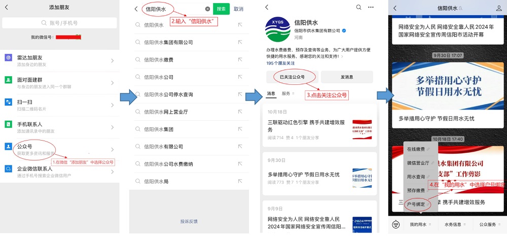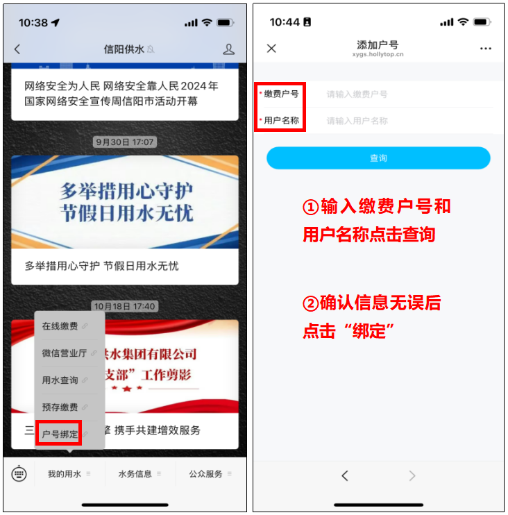 1、關注微信公眾號“信陽市供水集團有限公司”,點擊“我的用水”,找到“戶號綁定”。