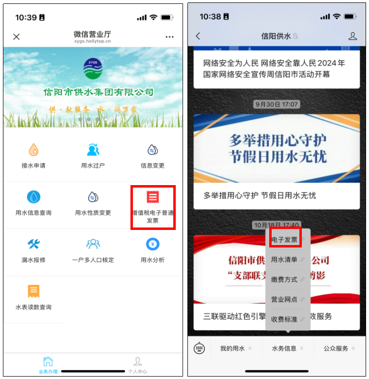 2、點擊“我的用水”里“微信營業廳”模塊,點擊[增值稅電子普通發票];也可以點擊“水務信息”找到“電子發票”。